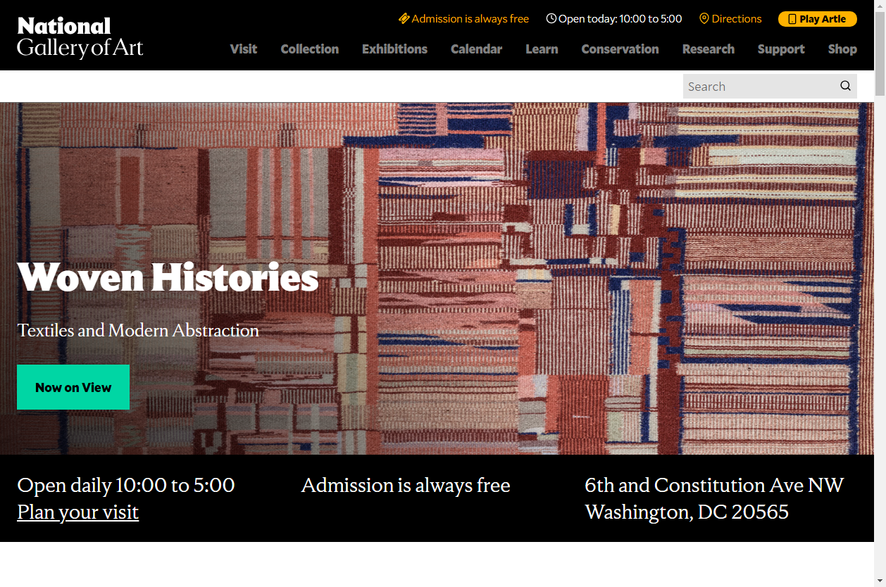 美国国家艺术馆网站是一个展示和宣传美国国家艺术馆(National Gallery of Art)的在线平台。该艺术馆位于美国华盛顿特区,是一座隶属于美国政府的公共艺术博物馆。该网站不仅提供了关于艺术馆的基本信息,如开放时间、地点、联系方式等,还展示了艺术馆丰富的馆藏精品,包括达芬奇、拉斐尔、马奈、莫奈、凡高、毕加索等大师的作品。