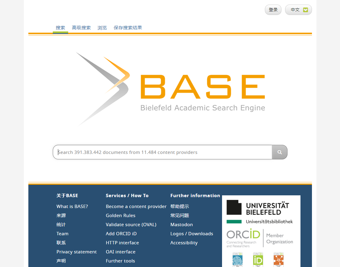 BASE是由德国比勒菲尔德大学图书馆创建的学术搜索引擎,自2004年9月上线以来,已经发展成为全球最大的多学科搜索引擎之一。BASE致力于为用户提供高质量的学术信息,至今已收录超过3亿多篇学术文献,其中约60%提供免费全文访问。BASE涵盖的学科范围广泛,包括计算机科学、哲学与心理学、宗教、社会科学、语言、科学、技术、艺术、文学、历史与地理等。文献类型丰富,包括期刊文章、学位论文、图书、报纸、预印本、图像、音频、视频、研究数据、软件等。此外,BASE支持多种语言搜索,包括英语、法语、德语、西班牙语、意大利语、波兰语、汉语、日语、俄语等。
