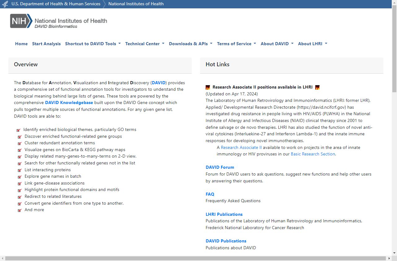 DAVID网站不仅是一个生物数据库,更是一款功能强大的在线分析软件。它主要用于基因的差异分析和通路的富集,能够将输入的基因列表关联到生物注释上。DAVID工具具有多种功能,包括但不限于识别丰富的生物主题、发现功能相关的基因组、对冗余注释术语进行聚类、在BioCarta和KEGG通路图上可视化基因、显示多个基因与多个术语的二维视图、搜索列表中未包含的其他功能相关基因、列出交互蛋白、批量探索基因名称、链接基因-疾病关联、突出显示蛋白质功能域和 motif、重定向到相关文献以及转换基因标识符等。